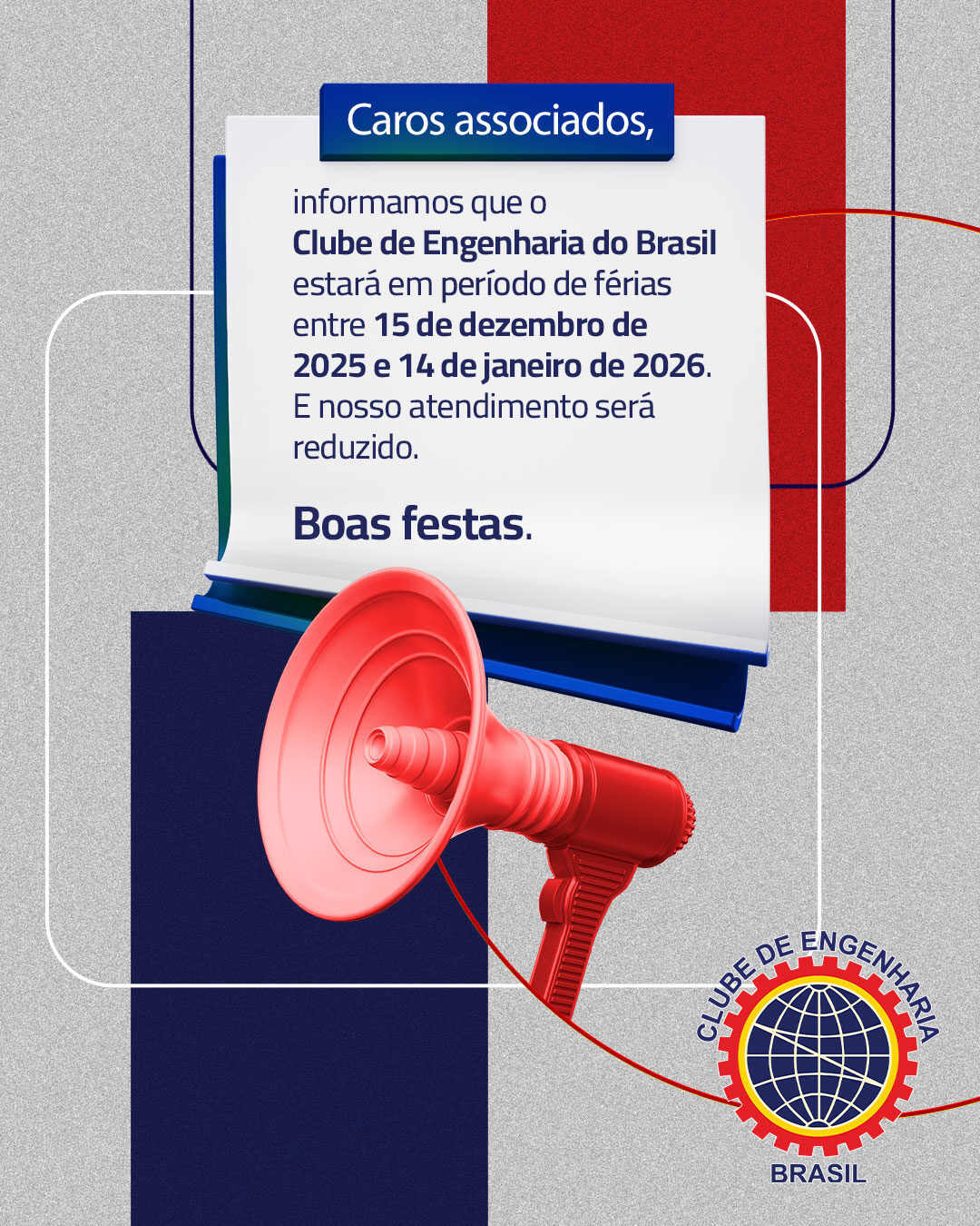 informamos que o Clube de Engenharia do Brasil estará em período de férias entre 15 de dezembro de 2025 e 14 de janeiro de 2026. E nosso atendimento será reduzido.