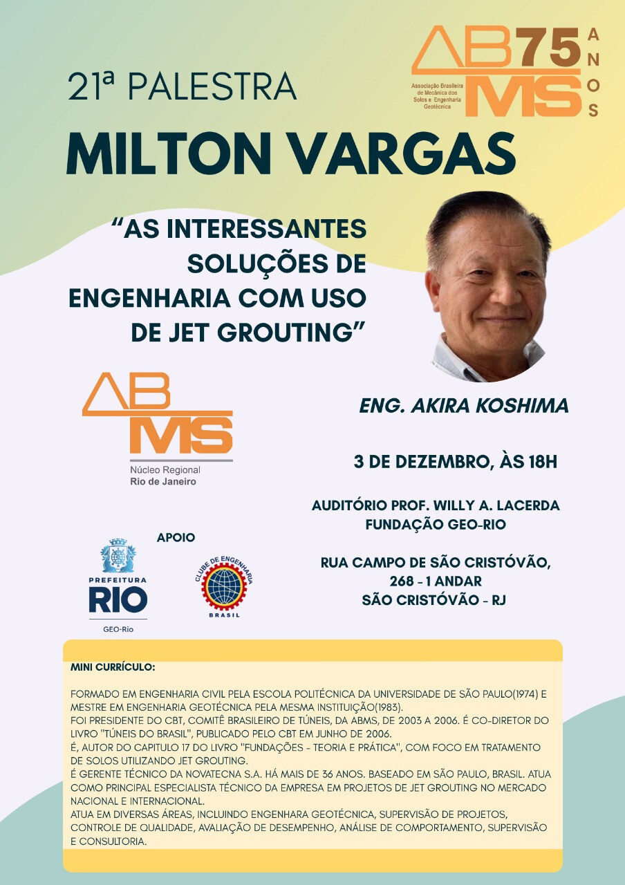 Neste ano com o engenheiro Akira Koshima, ex-presidente do Comitê Brasileiro de Túneis da ABMS e atual gerente técnico da Novatecna S.A. Ele apresentará o tema “As interessantes soluções de engenharia com uso de Jet Grouting”, e compartilhará sua vasta experiência em geotecnia, fundações e melhoria de solos.