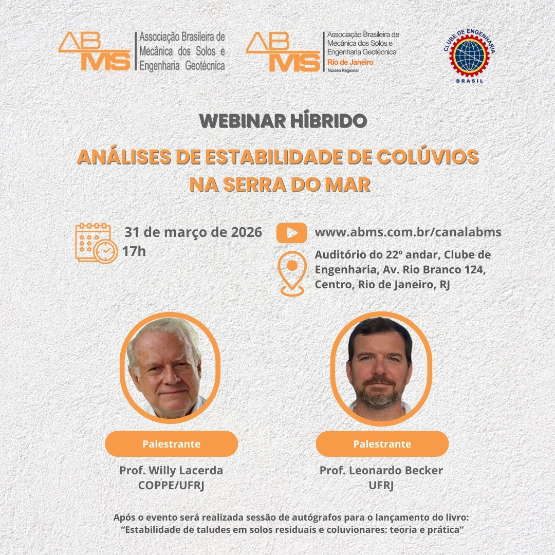 O Clube de Engenharia do Brasil (CEB) recebe no dia 31 de março de 2026, às 17h, o evento “Análises de estabilidade de colúvios na Serra do Mar”. A palestra aborda a estabilidade dos colúvios da região, a distribuição desses materiais em bacias hidrográficas e os mecanismos de instabilização. O debate inclui a seleção de parâmetros de resistência e a definição de ensaios. Ao fim, os palestrantes apresentam um caso prático. A atividade realizada pela Associação Brasileira de Mecânica dos Solos e Engenharia Geotécnica (ABMS) e a DTE de Geotecnia ocorre em formato híbrido, presencialmente no auditório do 22º andar do CEB e com transmissão ao vivo pela plataforma da ABMS.