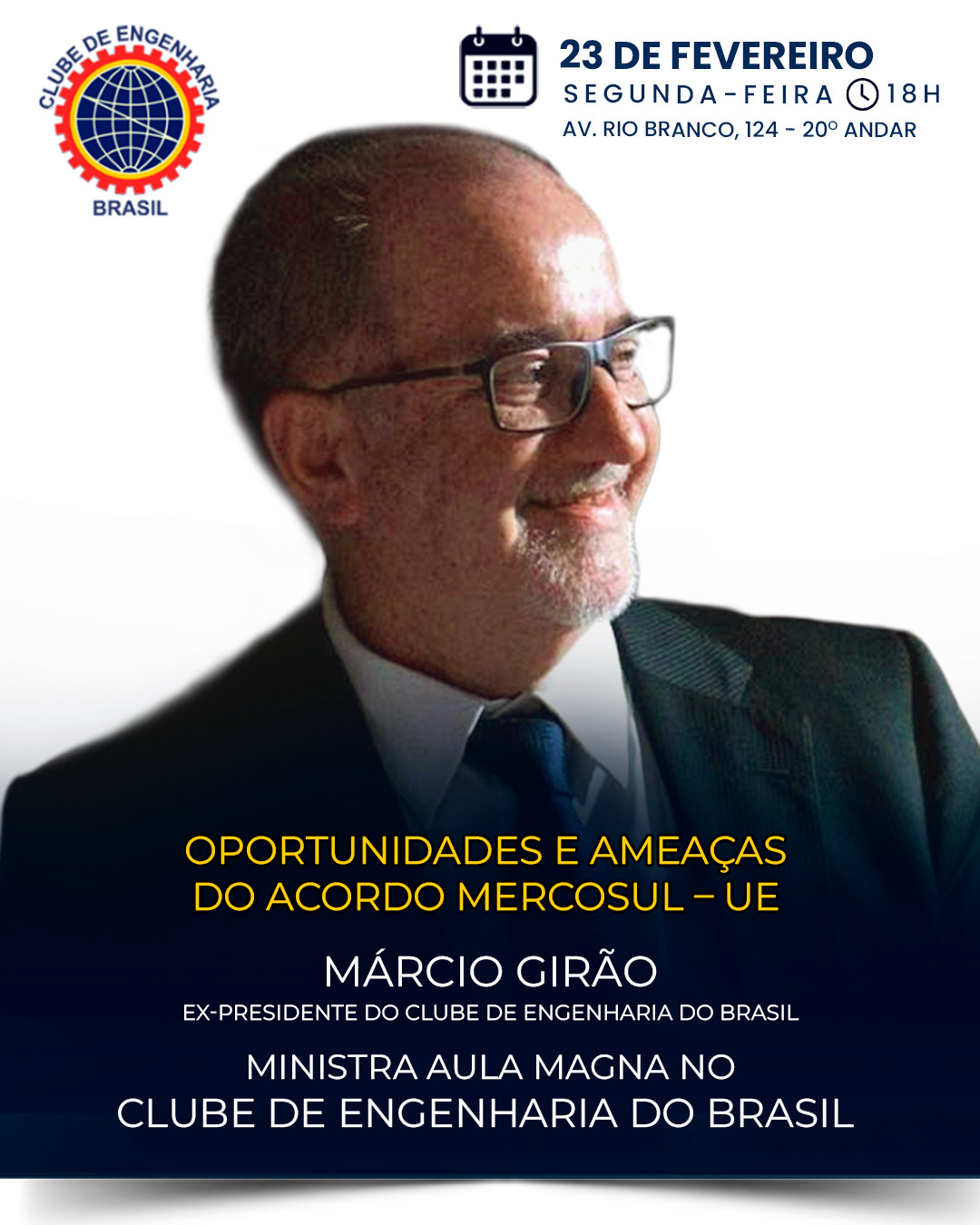 O engenheiro Márcio Girão, ex-presidente do Clube de Engenharia do Brasil (CEB), é o convidado da entidade para ministrar a aula magna a ser realizada na reunião do seu Conselho Diretor na segunda-feira, dia 23 de fevereiro, às 18horas. O tema será “Oportunidades e ameaças do acordo Mercosul – EU.”