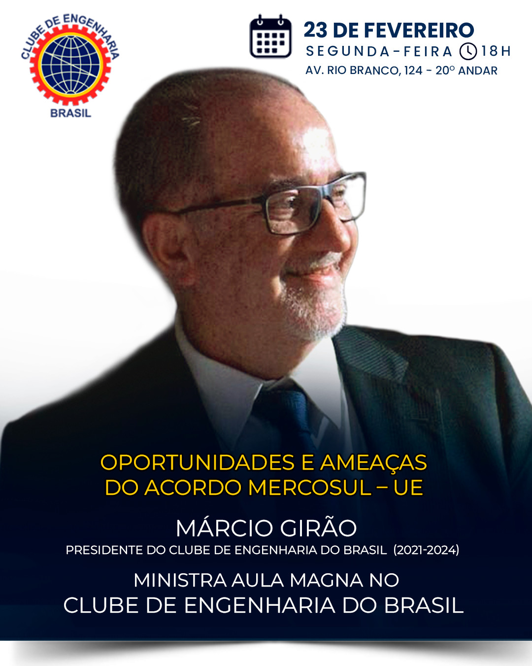 O engenheiro Márcio Girão, ex-presidente do Clube de Engenharia do Brasil (CEB), é o convidado da entidade para ministrar a aula magna a ser realizada na reunião do seu Conselho Diretor na segunda-feira, dia 23 de fevereiro, às 18horas. O tema será “Oportunidades e ameaças do acordo Mercosul – EU.”