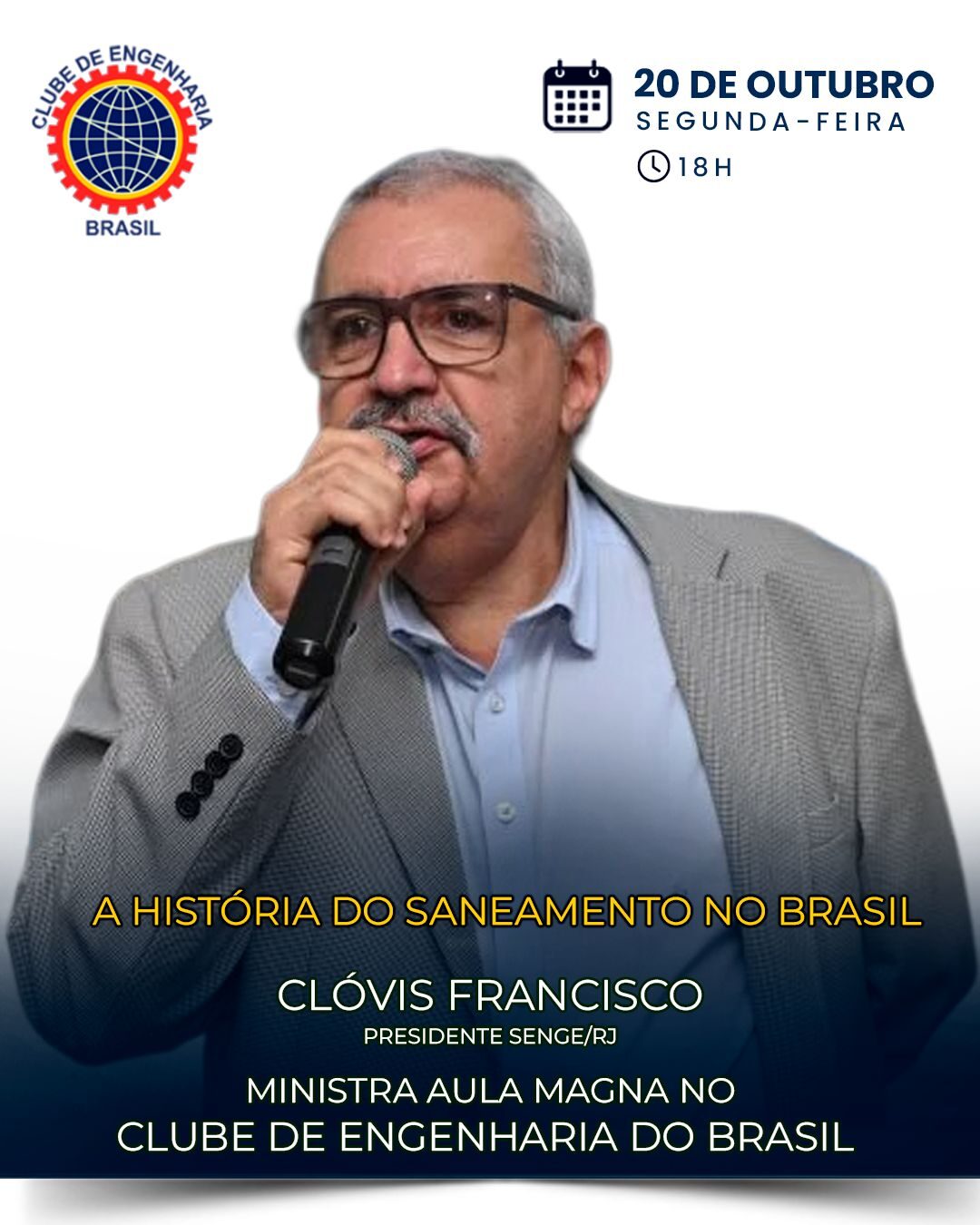 O engenheiro Clóvis Francisco do Nascimento Filho, presidente presidente do Sindicato dos Engenheiros no Estado do Rio de Janeiro – Senge/RJ, é o convidado do Clube de Engenharia do Brasil para ministrar a aula magna a ser realizada na reunião do seu Conselho Diretor na segunda-feira, dia 20 de outubro, às 18horas. O tema será “A história do saneamento no Brasil”.