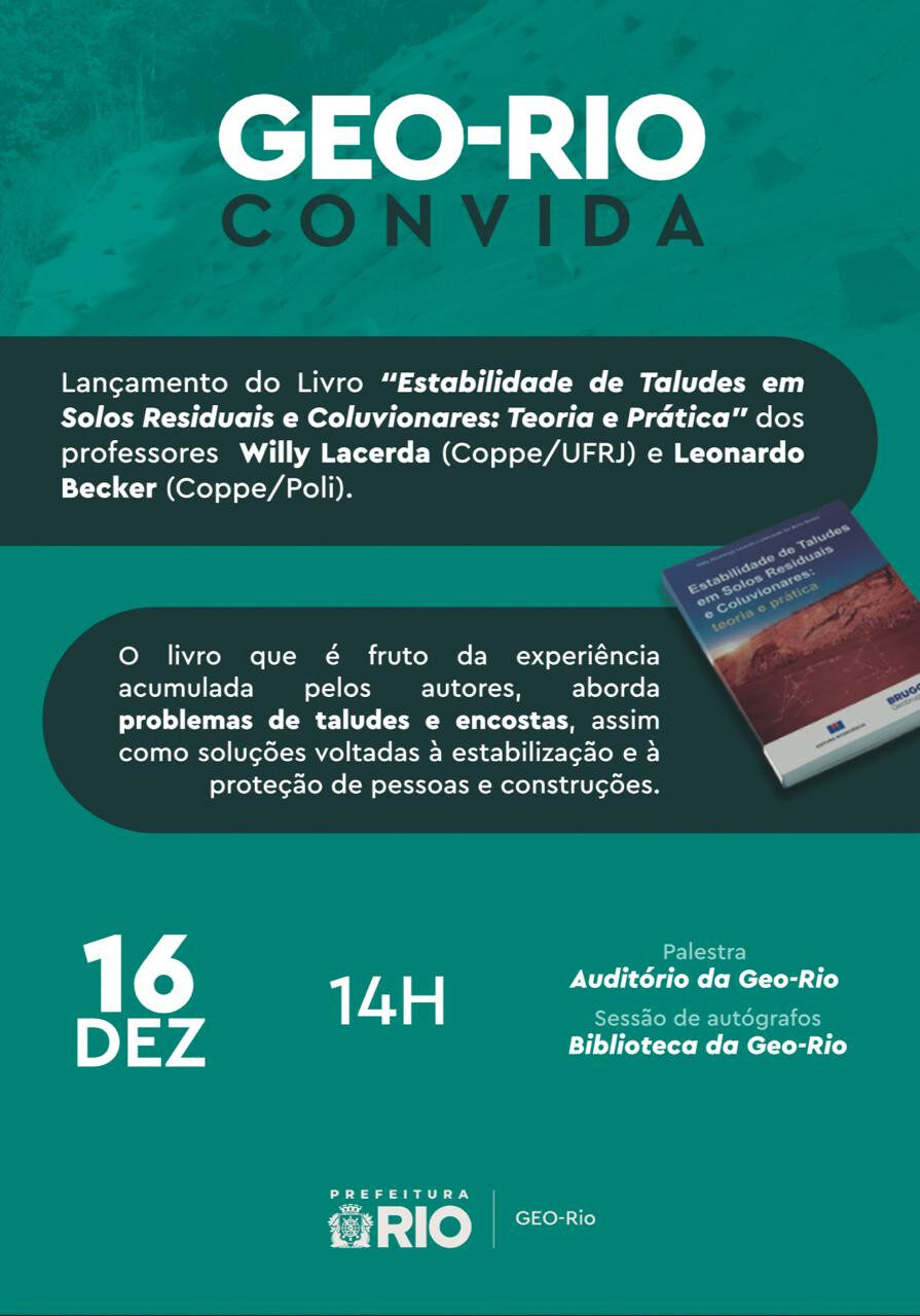 Os professores Leonardo Becker, da Escola Politécnica da UFRJ, e Willy Lacerda, da Coppe/UFRJ, irão lançar no dia 16 de dezembro, às 14horas, o livro “Estabilidade de Taludes em Solos Residuais e Coluvionares: Teoria e Prática”. A obra será apresentada em palestra no auditório da Geo-Rio, situada no Campo de São Cristóvão, 268 , em São Cristóvão.