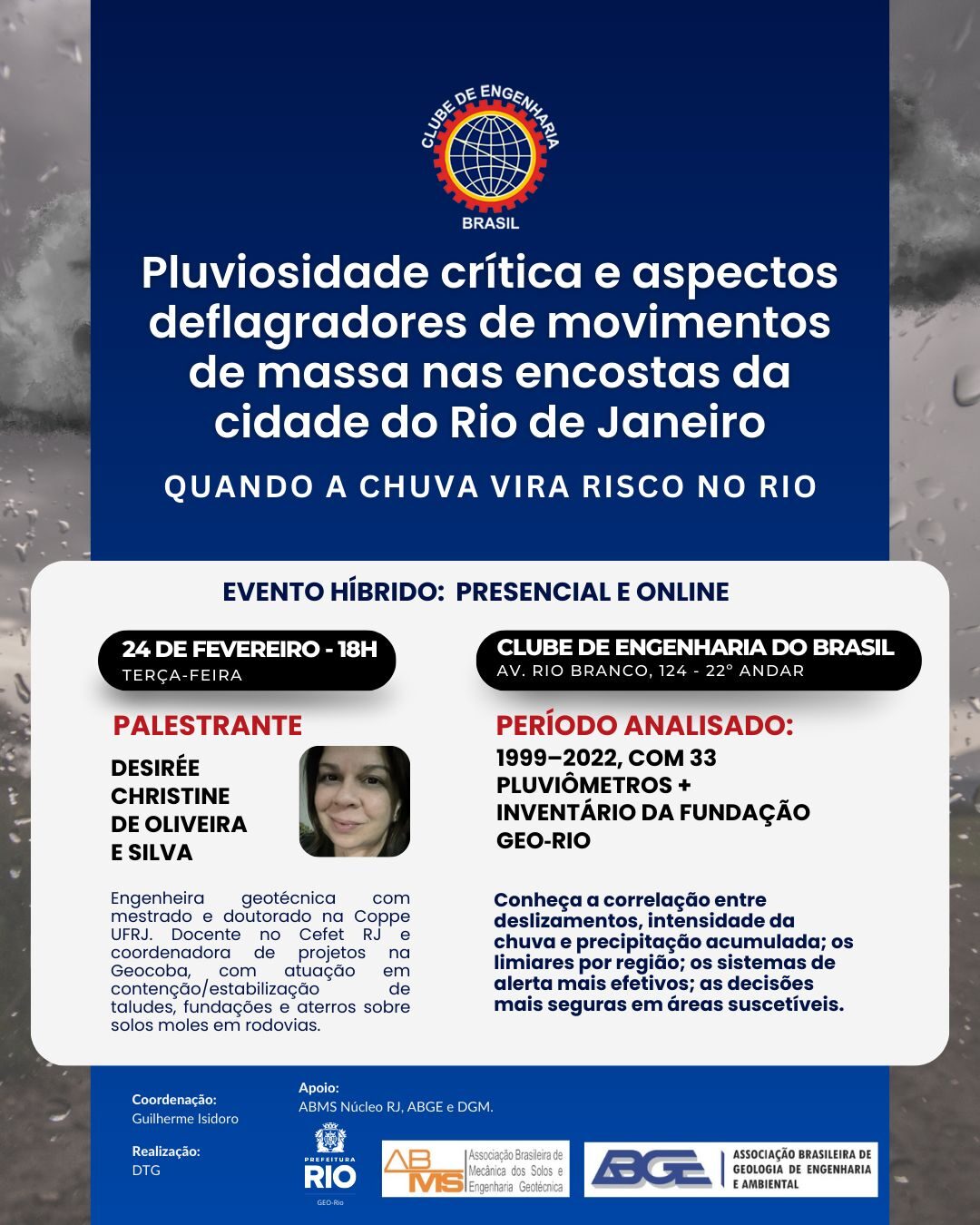 Desirée Christine de Oliveira e Silva Engenheira geotécnica (Uerj, Coppe-UFRJ), docente no Cefet-RJ e coordenadora na Geocoba, vai mostrar a correlação exata entre deslizamentos, intensidade da chuva e precipitação acumulada; os limiares críticos por região da cidade; os sistemas de alerta mais efetivos e as decisões mais seguras em áreas suscetíveis.