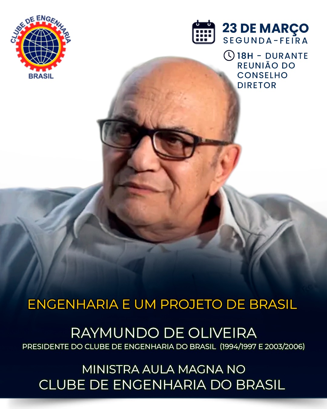 O engenheiro Raymundo de Oliveira, presidente do Clube de Engenharia do Brasil entre 1994 e 1997 e 2003 a 2006, fará a aula magna na reunião do Conselho Diretor da entidade na segunda-feira, dia 23 de março, às 18horas. O tema será “ Engenharia e um Projeto de Brasil”.