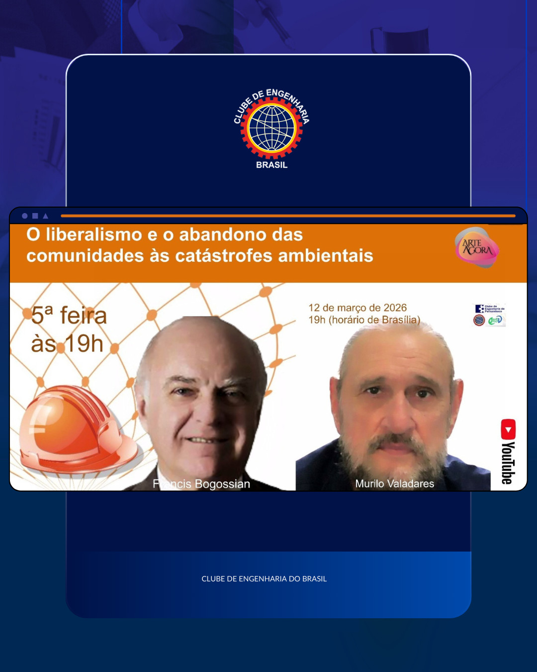 O presidente do Clube de Engenharia do Brasil, Francis Bogossian, participa nesta quinta-feira, dia 12 , às 19horas, da live “O liberalismo e o abandono das comunidades às catastrofes ambientais.”, no canal Arte Agora no Youtube. Junto com ele estará Murilo Valadares. [Acesse Aqui] e clique em “Ao Vivo”.