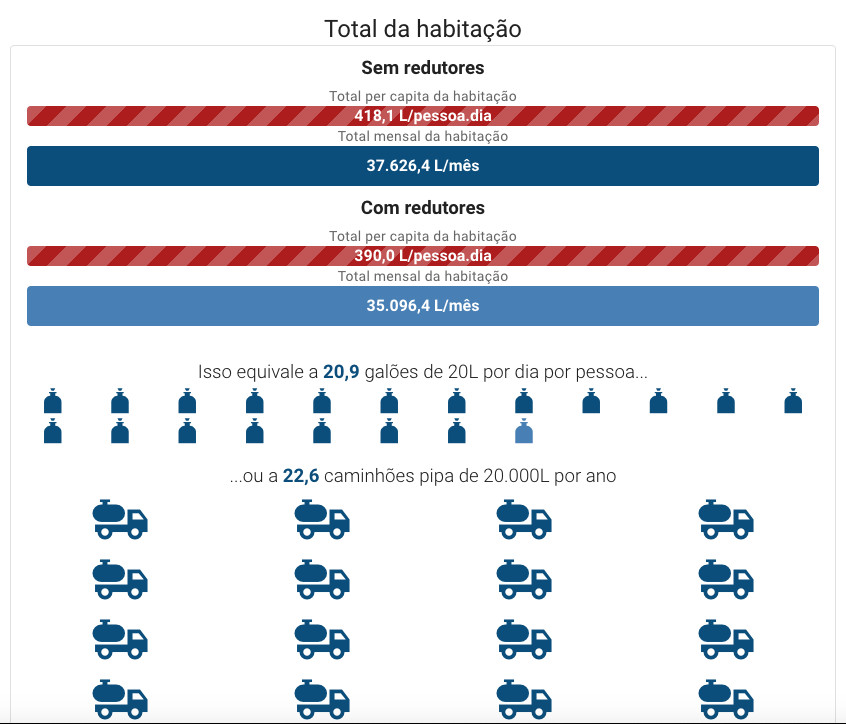 • Módulo de economia de água: permite simular o impacto da instalação de equipamentos economizadores, como arejadores e redutores de vazão, em diferentes pontos de consumo de água. O usuário pode ver a diferença no consumo de água com e sem a adoção dessas tecnologias simples.